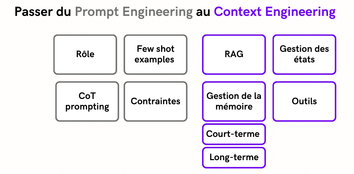À droite : les briques robustes du context engineering (RAG, mémoire, gestion des états stateful (conservant l’état), outils…).